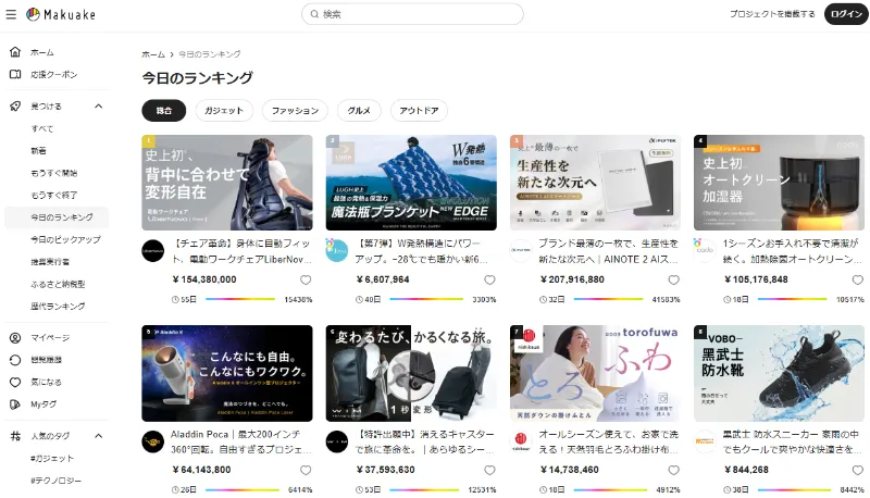 例えばMakuakeでは、スタートダッシュに成功したプロジェクトや支援が集まっているプロジェクトが以下画像のように今日のランキングや新着等で紹介され、人目に触れる機会が急増します。このように初日の支援獲得=プラットフォームを味方につけるマーケティングとも言えます。