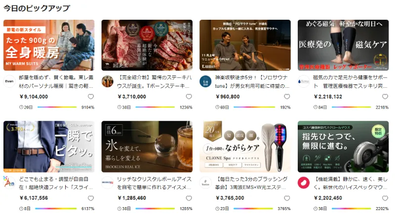 また、独自のプロモーション枠やタイアップ企画が存在し、話題性のあるプロジェクトはトップページで特集されたり、メールマガジンで紹介されることがあります。プロジェクト初日に目標30%達成など条件を満たすと「今日のピックアップ」や「今日のランキング」に掲載され、人目に触れる機会が飛躍的に増えるといわれています。