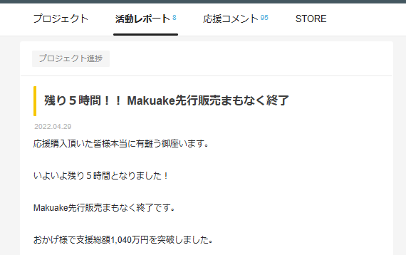 内容は進捗状況の報告や支援への感謝、メディア掲載のお知らせなど何でも構いません。重要なのはプロジェクトが今も動いていることを示すことです。