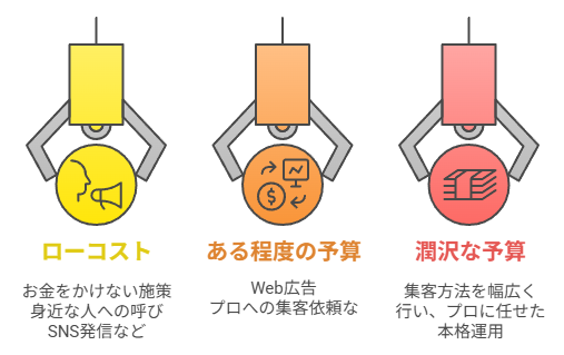 ここでは、予算規模の違いとクラファン進行フェーズの違いそれぞれの視点から、効果的な集客戦略の組み立て方を解説します。
