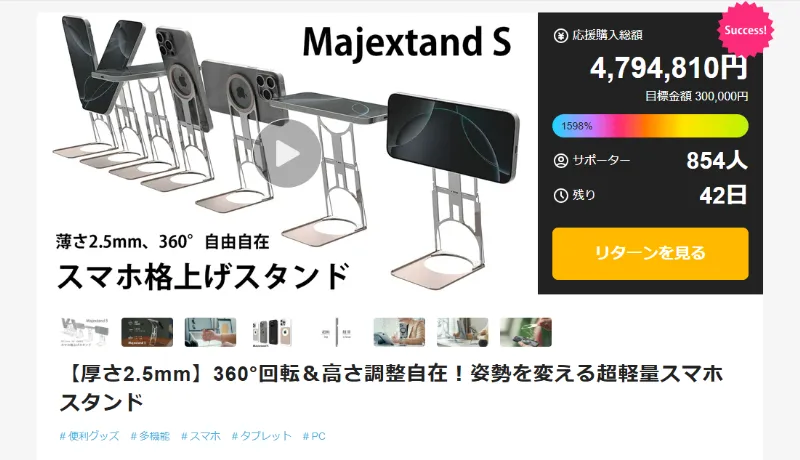 最後に紹介するのは、株式会社コペックジャパンによる「Majextand」。厚さわずか2.5mm、重さはたった30gながら、360度回転・高さ調整・角度調整が自在にできる超軽量スマホスタンドです。目標30万円を大きく超え、現在までに480万円近い支援を集めています。