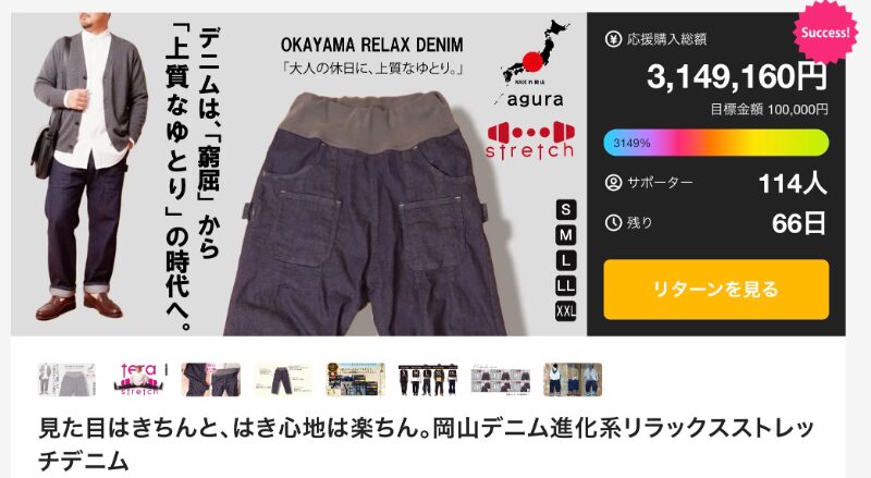 岡山デニムの伝統をそのままに、現代のライフスタイルに寄り添う形で進化したのが「岡山産大人のリラックスストレッチデニム」。見た目はきちんとしたジーンズなのに、実際に穿くとその柔らかさと伸縮性に驚かされます。タイトでもなく、ルーズでもない絶妙なシルエットは、オンでもオフでも違和感のない万能デザイン。デニム特有の“硬さ”や“重たさ”が苦手な人でも、まるでスウェットパンツのような軽やかさで、長時間穿いてもストレスを感じません。実際、目標金額10万円に対して310万円を突破し、110名以上の支援者を集めていることからも、その快適さと美しさの両立が高く評価されていることがわかります。
