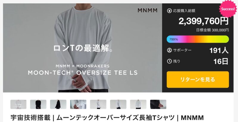 ファッションとテクノロジーの融合を体現した、MNMMの「ムーンテックオーバーサイズ長袖Tシャツ」。その最大の特徴は、宇宙船の温度調節に使われている“NASA開発素材”をベースにした特殊生地にあります。この生地は体温の変化を検知し、暑いときは熱を逃がし、寒いときは保温するという優れもの。まるで自分の肌が自動調整しているような心地よさを実現しています。さらに、洗濯を繰り返しても機能が落ちにくく、日常でも長く快適に着用できる点も魅力です。目標金額30万円に対し、すでに230万円を突破し190名以上が支援。まさに“次世代のTシャツ”として注目を浴びています。