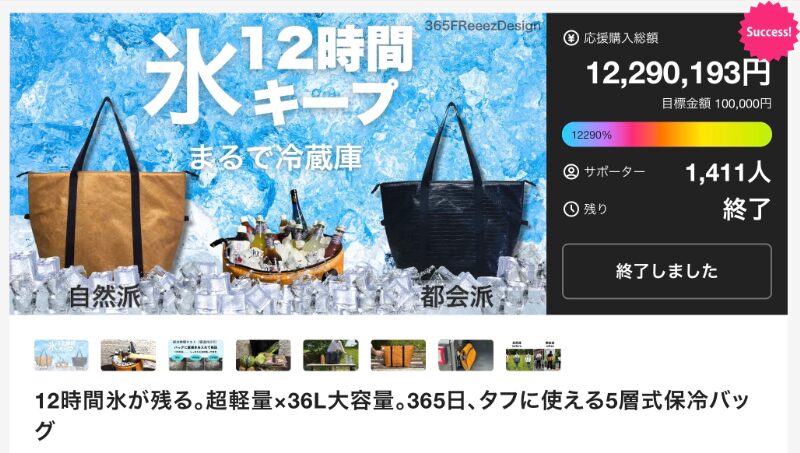 見た目もシンプルで洗練されており、“保冷バッグ=レジャー専用”という固定観念を覆すデザイン性も高評価。目標金額10万円に対し、最終的に1220万円以上の支援を集めており、「使い勝手が良すぎて2個買った」というリピーターの声も続出しています。「保冷バッグにしては…」ではなく、「これが一番いいバッグかも」と思わせる、まさに365日使いたくなるタフアイテムです。