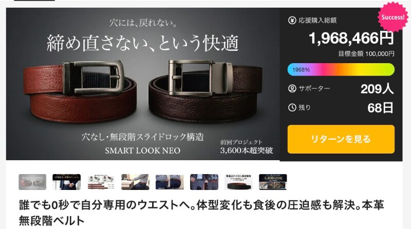 目標金額10万円に対して達成金額190万円以上、支援者200人を集めている本革ベルトは、株式会社テイルウィンドによるプロジェクトだ。無段階で調整可能な構造により、体型やシーンに応じて瞬時にフィットさせることができる点が特徴となっている。「0秒で自分専用のウエストへ」というコンセプトのもと、着用時のストレスを最小限に抑える設計が施されている。