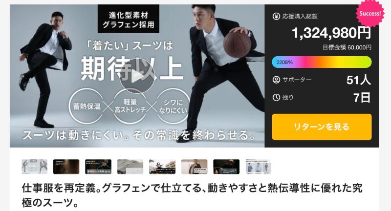 目標金額6万円に対して達成金額130万円、支援者50人を集めている高機能スーツは、SIMURGH JAPANによるプロジェクトだ。熱伝導性に優れたグラフェン素材を採用することで、温度調整性能と動きやすさを両立している点が特徴となっている。従来のスーツの概念を見直し、快適に働くための機能性を重視した新しい仕事服として注目されている。