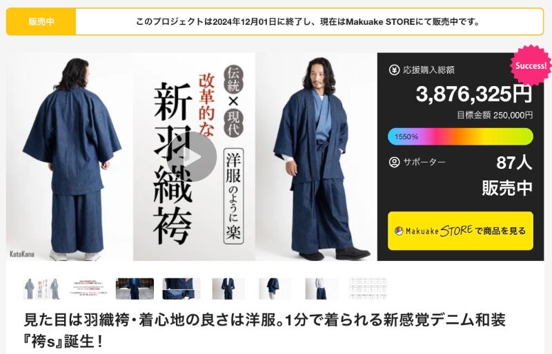 目標金額25万円に対して達成金額380万円以上、支援者87人を集めている「袴s」は、KataKana-カタカナ-によるプロジェクトだ。羽織袴のような見た目を持ちながら、洋服のような着心地と手軽さを実現している点が特徴で、わずか1分で着用できる設計となっている。伝統的な和装の美しさを、より身近に楽しめるアイテムとして注目されている。