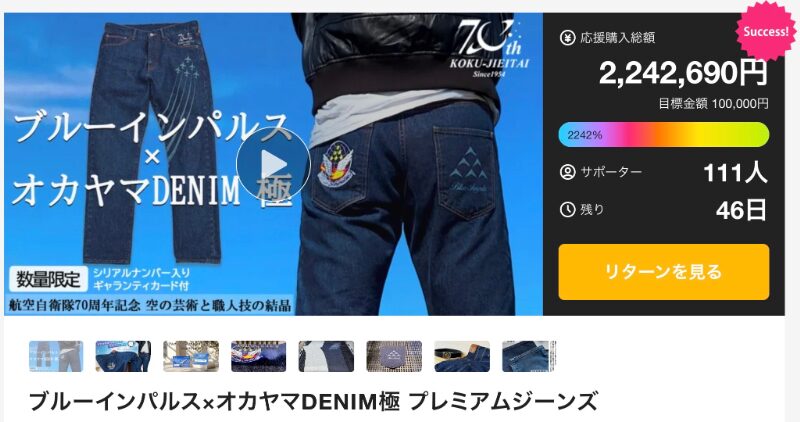 目標金額10万円に対して達成金220万円以上、支援者110人を集めている「ブルーインパルス×オカヤマDENIM極」は、BELLUNA Men’sによるプロジェクトだ。日本を代表する存在とのコラボレーションにより生まれた特別なジーンズで、素材やディテールにこだわったプレミアムな仕上がりが特徴となっている。岡山デニムの品質を活かしながら、独自の価値を付加したアイテムとして注目されている。