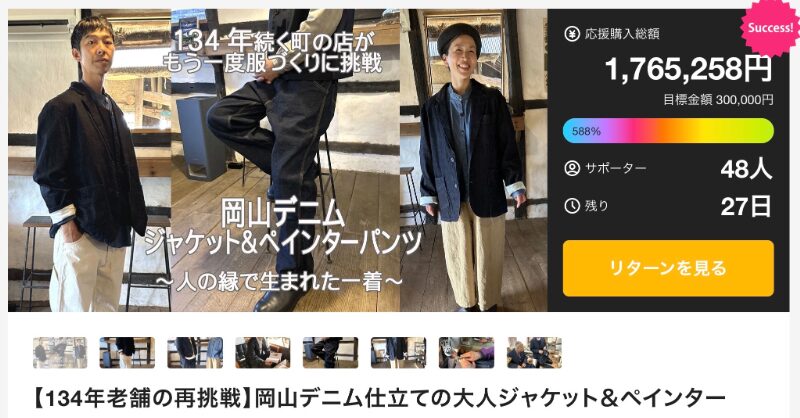 目標金額30万円に対して達成金170万円、支援者40人を集めているデニムウェアは、marumiya-worldによるプロジェクトだ。134年の歴史を持つ老舗が手がけるアイテムで、岡山デニムを使用したジャケットやペインターパンツが展開されている。伝統的な技術と現代的なデザインを融合させた点が特徴で、大人のカジュアルスタイルを引き立てる製品となっている。