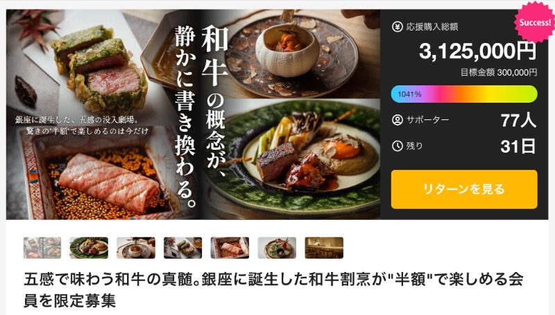 参照:五感で味わう和牛の真髄。銀座に誕生した和牛割烹が”半額”で楽しめる会員を限定募集(makuake)