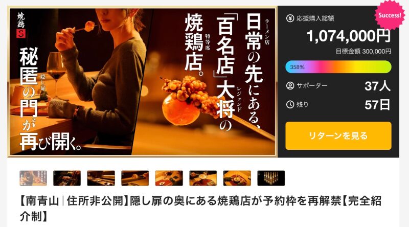 目標30万円に対し達成金100万円以上、支援者30人を集めるのが「Makuake限定特価おまかせお食事コース」。実行社は、南青山の完全紹介制焼鶏店、焼鶏Sだ。隠し扉の奥にあるというロケーションからして、非日常感は十分。限られた人だけが辿り着ける特別な空間が広がる。