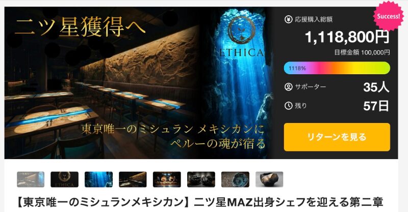 目標10万円に対し達成金110万円、支援者30人を獲得しているのが「ETHICA 会員権」。実行社は銀座のメキシカンレストラン、銀座 ETHICAだ。東京唯一のミシュラン掲載メキシカンとして注目を集める同店は、二ツ星レストランMAZ出身シェフを迎え、新たな章へと踏み出す。