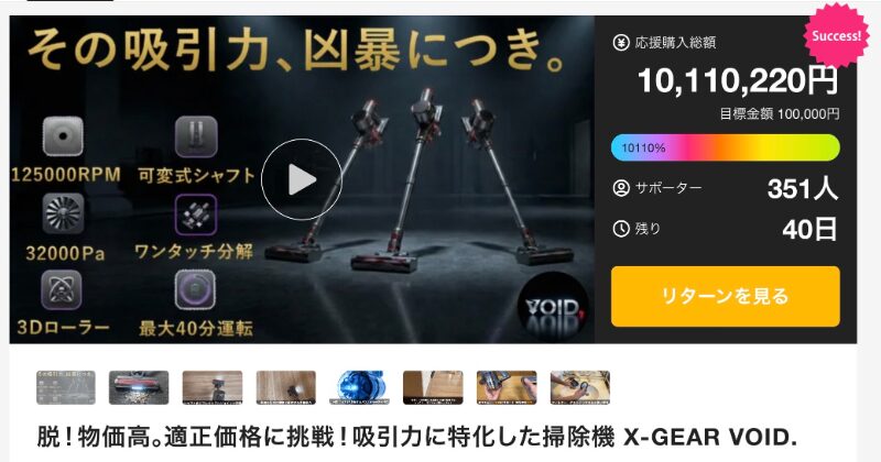 目標10万円に対し達成金1010万円以上、支援者350人を集める「完成したVOID」。実行社はNWO JAPAN。吸引力に特化したコードレス掃除機で、物価高が続く中でも適正価格を追求し、性能とコストパフォーマンスの両立を実現している。