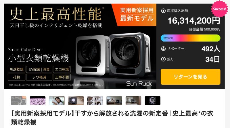 目標50万円に対し達成金1630万円、支援者490人を集める「Smart Cube Dryer」。実行社はSunRuck。実用新案を採用した衣類乾燥機で、干すという作業そのものを省略する発想から生まれた製品だ。コンパクトながら高い乾燥効率を実現し、限られた室内スペースでも設置しやすい設計となっている。