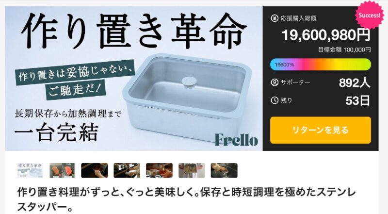 目標10万円に対し達成金額1960万円以上、支援者890人を集めている「定番セット」。実行社はFrello。保存と時短調理をテーマに開発されたステンレスタッパーで、作り置き料理の保存品質を高めることを目的としている。一般的なプラスチック容器とは異なり、ステンレス素材を採用することで耐久性と衛生性を両立している点が特徴だ。