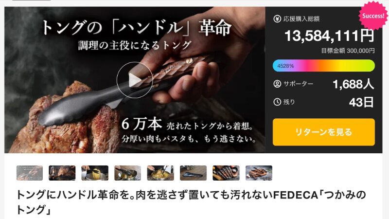 目標30万円に対し達成金1350万円、支援者1680人を集めている「二刀流・完結フルセット」。実行社はFEDECA。トングというシンプルな道具に新しい設計思想を取り入れ、肉や食材をしっかり掴みながらも衛生的に扱える構造を実現している。