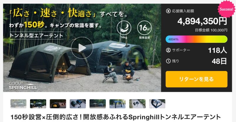 目標金額10万円に対して達成金額490万円、支援者110人を集めている「Springhill トンネル型エアーテント」は、GOOUT SPRINGHILLによるプロジェクトだ。空気を入れることで設営できる構造を採用し、約150秒という短時間で設営が可能な点が特徴となっている。さらに広々とした内部空間により、アウトドアでの快適な滞在をサポートする設計が施されている。