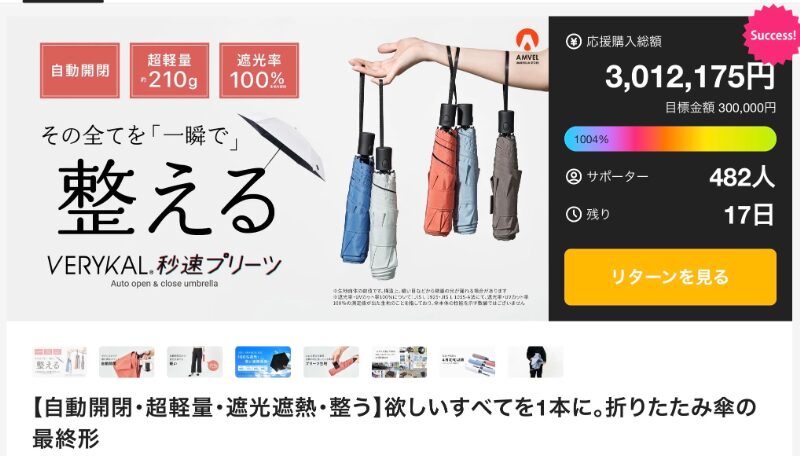 目標金額30万円に対して達成金額300万円以上、支援者480人を集めている折りたたみ傘は、AMVEL UMBRELLA STOREによるプロジェクトだ。自動開閉機能、軽量設計、遮光・遮熱性能など、日常で求められる機能を一本に集約した設計が特徴となっている。雨の日だけでなく、日差し対策としても活用できる多機能性が魅力だ。