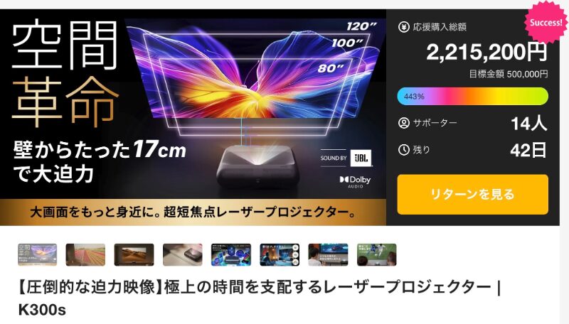 目標50万円に対し達成金額220万円以上、支援者10人を集めている「レーザープロジェクター」。DAI Tradingが展開するK300sは、高精細な映像と高輝度を兼ね備え、家庭でも外出先でも本格的な映像体験を実現することを目指したプロダクトだ。レーザー光源を採用することで、色再現性やコントラスト性能を高め、よりリアルで奥行きのある映像表現を可能にしている。