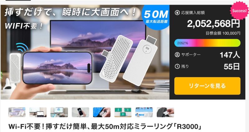 目標10万円に対し達成金210万円以上、支援者150人を獲得している「ミラーリングアダプター」。株式会社UNOUが手がけるR3000は、Wi-Fi環境を必要とせず、デバイスに挿すだけで画面共有が可能になるシンプルさが特徴だ。最大50メートルの通信距離に対応し、安定した映像伝送を実現している。