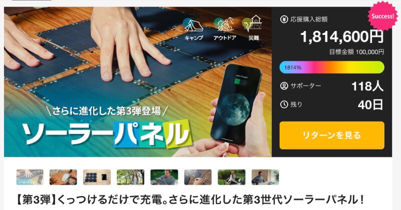目標10万円に対し達成金200万円、支援者130人を集めている「太陽光さえあればどこでも充電!ソーラブリック」。SETO WORKSが展開するこの第3世代モデルは、従来のソーラーパネルをさらに進化させ、設置の手軽さと充電効率の向上を両立している。くっつけるだけで使用できるシンプルな構造が、日常使いからアウトドアまで幅広いシーンに対応する。
