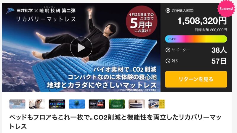 目標金額20万円に対し達成金160万円以上、支援者40人を集めている「シングルサイズ」。睡眠技研が手がけるこのリカバリーマットレスは、環境配慮と機能性を両立した設計が特徴だ。CO2削減という社会的な課題に向き合いながらも、使用者の身体をしっかりと支える構造を実現しており、“持続可能な快適さ”という新しい価値を提示している。