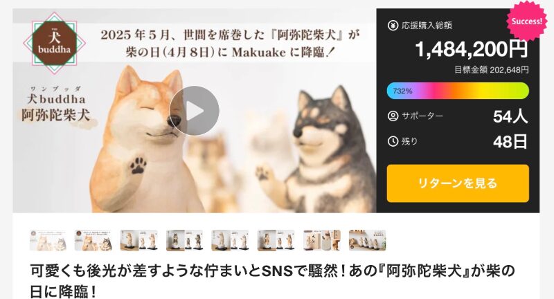 目標金額20万円に対し達成金140万円、支援者50人を獲得している「犬buddha」。株式会社MORITAが展開する本製品は、柴犬と仏像を掛け合わせたユニークなデザインで、“癒し”という価値を視覚的に表現している。SNSでも話題となったその佇まいは、可愛らしさと神秘性を兼ね備え、見る人の心に強い印象を残す。