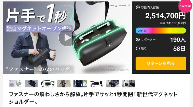 目標金額10万円に対して達成金額250万円以上、支援者190人を集めている「MAG SMART」は、Gadget Drive Tokyoによるプロジェクトだ。ファスナーを使わず、マグネットによって開閉できる構造が特徴で、片手で素早くアクセスできる利便性が大きな魅力となっている。わずか1秒で開閉できる設計は、荷物の出し入れにかかる時間を大幅に短縮し、移動中や急いでいる場面でもストレスなく使える点が評価されている。また、シンプルで直感的な操作性は、年齢やシーンを問わず誰でも扱いやすく、日常使いに適した実用性の高さも注目ポイントとなっている。