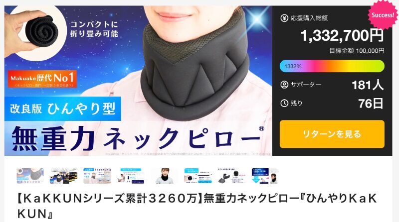 目標金額10万円に対して達成金額130万円以上、支援者180人を集めている「ひんやりKaKKUN」は、赤坂元気堂・治療院によるプロジェクトだ。首への負担を軽減する“無重力”設計に加え、ひんやりとした冷感素材を採用している点が特徴で、移動中や休憩時の快適性を高めている。首元にしっかりとフィットする構造により安定感のある支えを実現し、長時間の使用でも負担を感じにくい設計となっている。また、通気性や肌触りにも配慮されており、蒸れにくく快適な使用感が持続する点も評価されている。