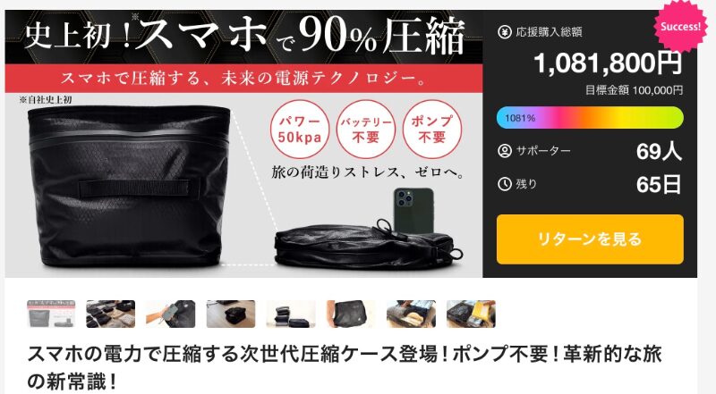 目標金額10万円に対して達成金額100万円、支援者60人を集めている「SlimVac」は、株式会社イーストメディカルによるプロジェクトだ。スマートフォンの電力を利用して内部の空気を抜き、衣類などを圧縮できる仕組みを採用している点が特徴となっている。ポンプを使わずに圧縮できる手軽さにより、従来の圧縮バッグに比べて準備や作業の手間を大幅に軽減している。また、デジタルデバイスと連携することで誰でも簡単に扱える設計となっており、旅行時の新しい収納スタイルとして注目されている。