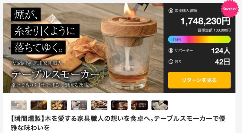 目標金額10万円に対して達成金額170万円以上、支援者120人を集めているテーブルスモーカーは、CondeHouseによるプロジェクトだ。木を扱う家具職人の技術と発想から生まれたこの製品は、食卓で手軽に燻製を楽しめる点が特徴となっている。北海道産の木材を使用したウッドチップによって、素材の香りと味わいを引き出し、家庭でも本格的な燻製体験を実現できる設計が魅力だ。