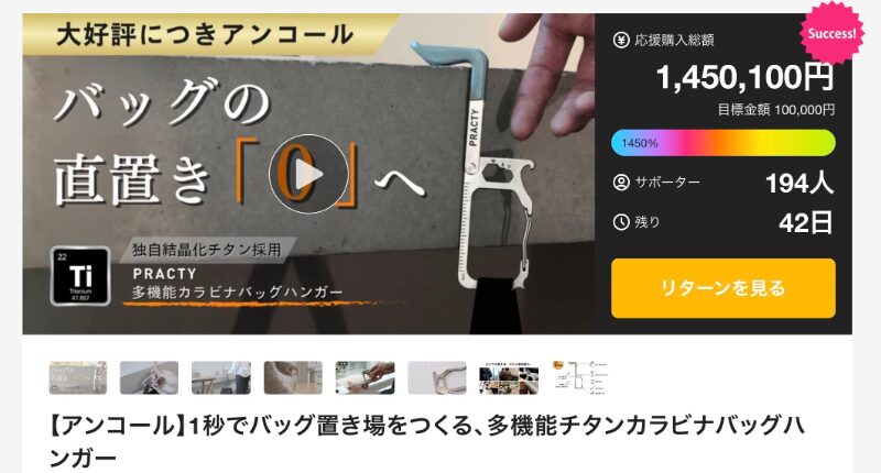 目標金額10万円に対して達成金額140万円以上、支援者190人を集めている「PRACTY CaraHanger」は、PRACTYによるプロジェクトだ。カラビナ形状を活かし、テーブルなどに引っ掛けることで瞬時にバッグ置き場を作れる点が特徴となっている。チタン素材を使用した軽量かつ高強度な設計により、持ち運びやすさと耐久性を両立している点も魅力だ。