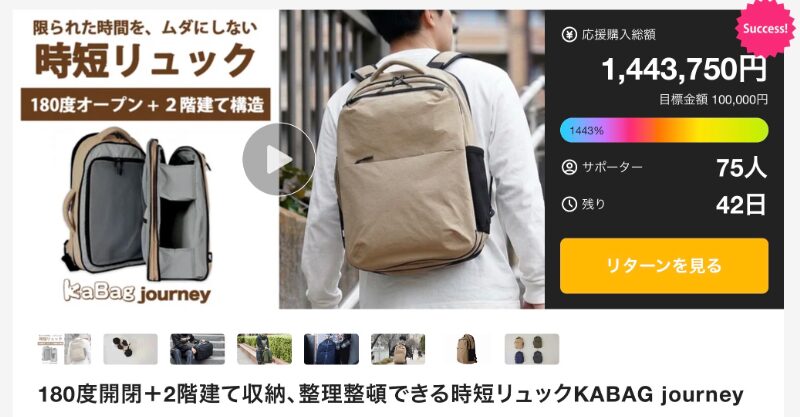 目標金額10万円に対して達成金額140万円、支援者70人を集めている「KABAG journey」は、KABAGによるプロジェクトだ。180度開閉できる構造と2階建て収納を採用し、荷物を効率的に整理できる点が特徴となっている。内部が見やすく取り出しやすい設計により、日常の使い勝手を大きく向上させている。