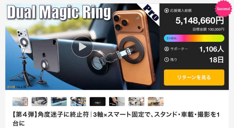 支援者1100人以上、達成金額510万円超という数字は、この“角度迷子”問題がどれほど多くの人にとって切実だったかを物語っています。新型メタルプレートによる強力な固定力と、金属ならではの耐久性は、長期間使い続けられる信頼感を生み、ガジェットとしての完成度も非常に高いレベルにあります。単なるスマホスタンドではなく、「視界のストレスをなくすための道具」として成立している点が、このプロジェクトの最大の価値です。