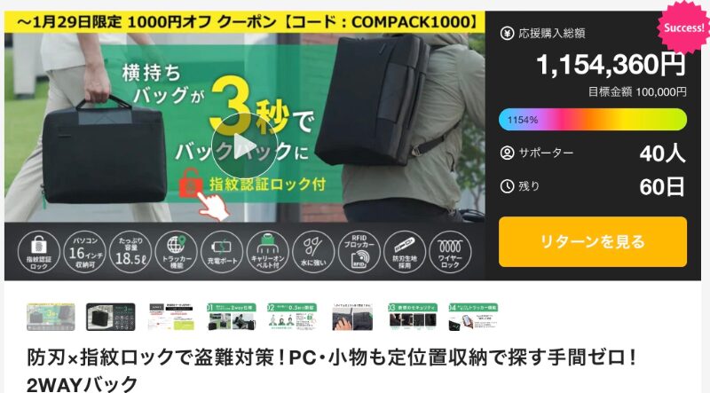 さらに魅力なのは、定位置収納設計によって探す手間を減らし、日常の効率まで高めている点だ。ただ守るだけではなく、使いやすさと整理の快適さも両立している。達成金110万円以上という実績は、必要性を感じる層が確実に存在する証拠だろう。防犯性と利便性を兼ね備えたComPackは、“安心を持ち運ぶ”バッグとして注目されている。