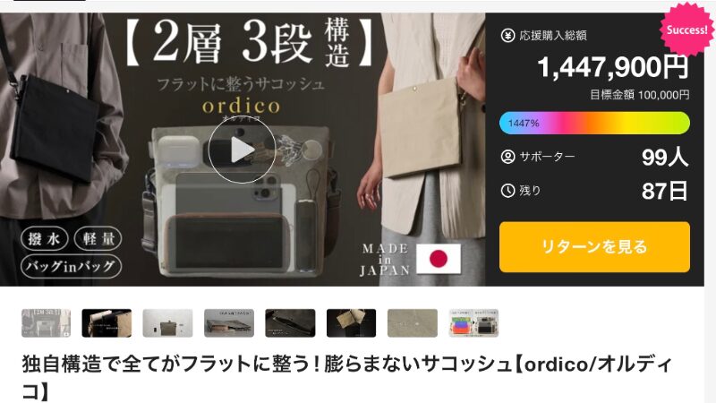 見た目はミニマルでありながら、使い勝手は極めて実践的。財布、スマートフォン、小物類がそれぞれ干渉せずに収まることで、取り出しやすさも格段に向上している。達成金140万円、支援者90人という結果は、この地味だが確実な改良が多くの人の日常に刺さった証拠だろう。毎日の外出をストレスなく支える道具として、完成度の高さが際立つ。