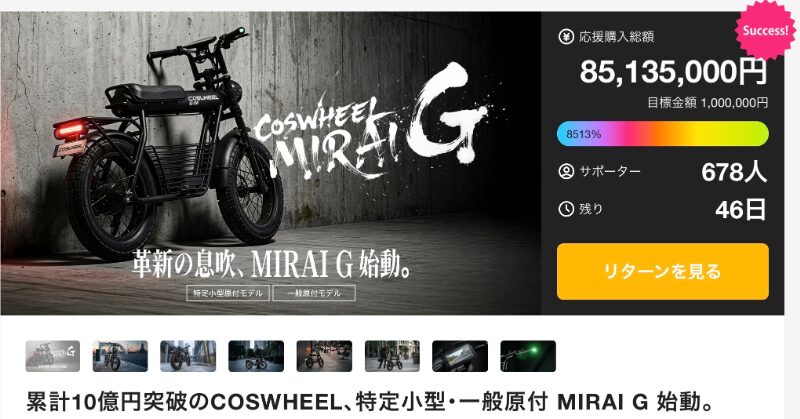 目標金額100万円に対し、達成金額は8490万円以上、支援者数は670人という圧倒的な支持を獲得。注目されているのは、法規対応を踏まえた安心感と、日常使いに耐える実用設計です。通勤やちょっとした移動が「作業」ではなく「快適な時間」に変わる感覚は、多くの支援者が共感したポイントでもあります。現在も継続中の本プロジェクトは、移動の価値観そのものを更新しようとしています。