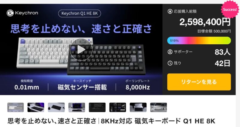 さらに磁気スイッチの採用により、キー入力の精度や耐久性も高水準で両立している点が特徴だ。目標50万円に対し達成金額250万円以上、支援者80人という結果は、ニッチでありながら確実に刺さる層が存在することを示している。付属のシリコンパームレストに至るまで、長時間作業を前提とした設計は、単なる周辺機器ではなく、思考環境を整えるツールとしての完成度を感じさせる。