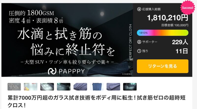 洗車後や入浴後、拭き上げ作業にかかる時間は決して短くない。pappyが展開するPERFECT DRYは、累計7000万円超の実績を持つガラス拭き技術をボディ用へ応用し、拭き筋ゼロという理想に迫ったクロスだ。水分を瞬時に吸収し、残らない。そのシンプルさが圧倒的な時短を生む。