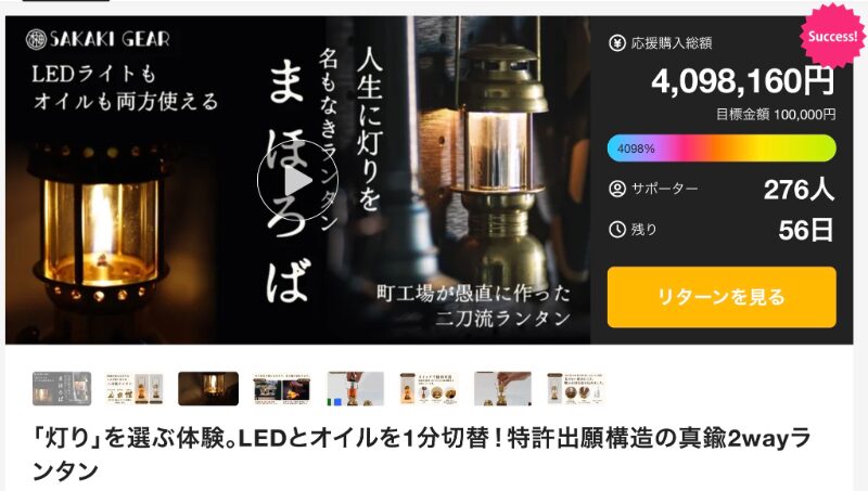 目標10万円に対し、達成金額400万円、支援者数270人を集めているsakakibarakoukiの「LEDランタン」。特許出願構造の真鍮ボディに、LEDとオイルランタン機能を1分で切り替えられる2way仕様を融合させた意欲作だ。キャンプやベランダ時間、停電時の備えまで、シーンに応じて“実用の灯り”と“情緒の灯り”を使い分けられるのが最大の魅力である。