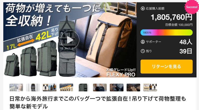 目標10万円に対し、達成金額180万円以上、支援者40人を集め継続中の株式会社Erfolgによる「FLEXY PRO」。一見スタイリッシュなバッグだが、その真価は“拡張性”と“吊り下げ収納”にある。出張や海外旅行はもちろん、ジムや通勤、週末のお出かけまで、用途に合わせて容量を自在に調整できる設計だ。