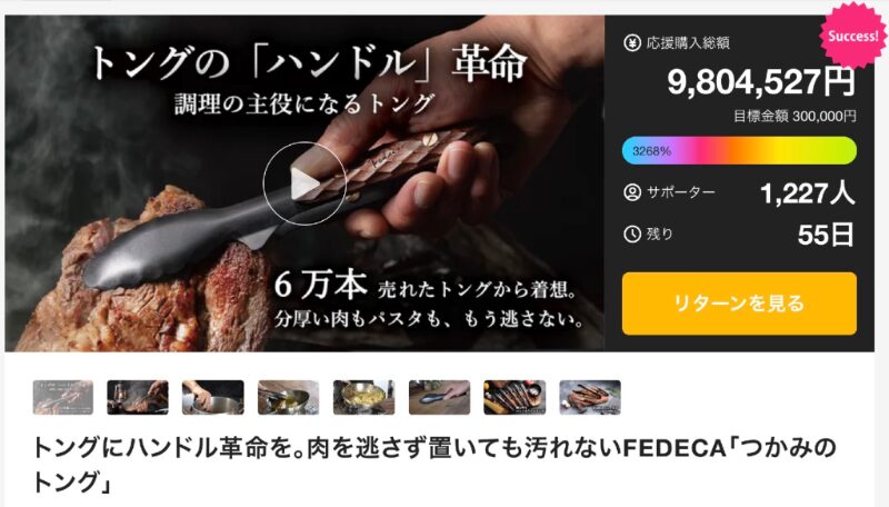 目標30万円に対し、達成金額は980万円以上、支援者数1,220人を突破。FEDECAが手がける「つかみのトング」は、アウトドア愛好家や料理好きの常識を覆す一本だ。注目のリターン「二刀流・完結フルセット」には、調理からサーブまでを一貫して担える設計思想が凝縮されている。