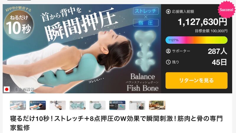 目標金額10万円に対して達成金額110万円、支援者280人を集めているセルフケアアイテムは、MAOMAによるプロジェクトだ。筋肉と骨の専門家の監修のもと開発された製品で、寝るだけでストレッチと8点押圧の刺激を同時に与える構造となっている。忙しい日常の中でも短時間で体を刺激できることを目指しており、わずか10秒の使用でも体への刺激を感じられるよう設計されている。