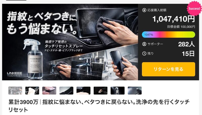 目標金額10万円に対して達成金額100万円以上、支援者280人を集めている「TOUCH RESET」は、LINKEEEによるプロジェクトだ。スマートフォンやタブレットなどの画面に付着する指紋や油分を取り除き、ベタつきのない快適な操作感を取り戻すことを目的としたクリーナーとして開発された。デバイスを頻繁に使う現代の生活において、画面の清潔さや操作感を維持するためのアイテムとして注目されている。