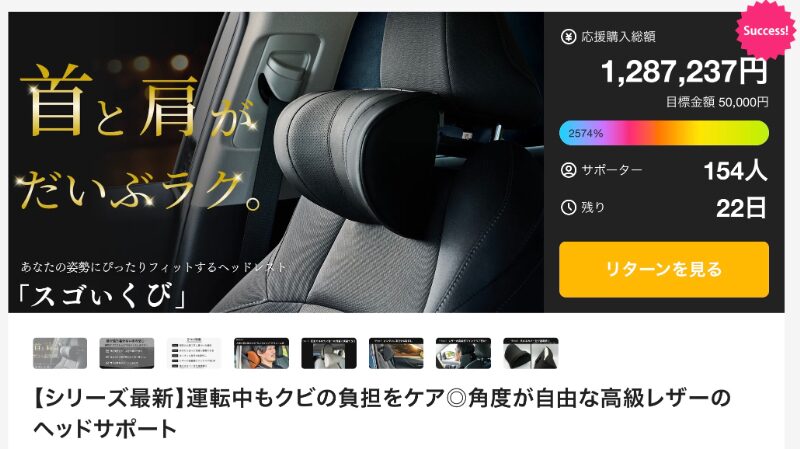 そして最後は、JAPANCROWNDFUNDINGが手掛ける「すごいクビ」。高級レザー仕様のヘッドサポートとして注目を集める本商品は、目標金額5万円に対し120万円以上を達成し、150人以上の支援者から支持を受けています。シリーズ最新作となる今回は、角度調整機能と素材の改良によって“ドライバーの快適性”をさらに追求。長時間運転による首や肩の負担を軽減し、自然な姿勢を保つサポートを実現しています。
