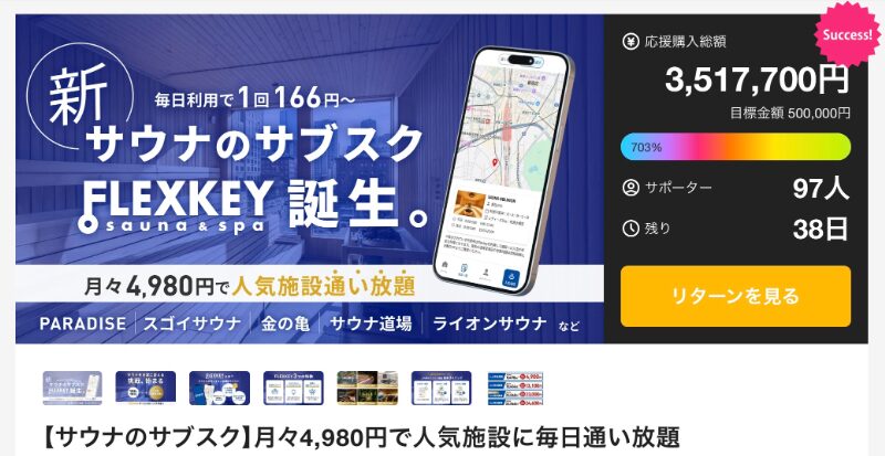 次に紹介するのは、株式会社OPTIMSTによる「サウナのサブスク」。月額4,980円で提携施設のサウナを毎日利用できるという、まさに“整い放題”の新サービスです。目標金額50万円に対し、既に350万円を突破し、90人の支援者が集まるなど、都市生活者を中心に話題を呼んでいます。忙しい現代人にとって、心身をリセットできる時間は貴重。しかし、都度の利用料や混雑がハードルになることも。そんな悩みを解消するのが、この「定額で通えるサウナ体験」です。