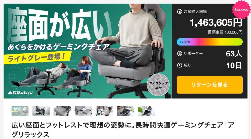 ゲーム用途に限らず、在宅ワークや趣味の時間など、座る時間そのものを快適に変えてくれる点が評価されている。支援者数は多くはないものの、達成金額が示すように、価値を理解した層から強く支持されているプロジェクトだ。長時間の集中や作業効率を求める人にとって、環境を整える選択肢の一つとなっている。