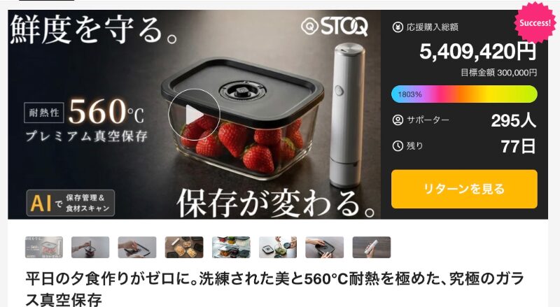 目標金額30万円に対して達成金額540万円以上、支援者290人を集めている真空保存容器は、NAYU株式会社によるプロジェクトだ。最大560℃の耐熱性を持つガラス素材と真空保存機能を組み合わせた設計が特徴で、調理から保存までを一つで完結できる点が魅力となっている。洗練されたデザインも相まって、機能性と見た目の両方を重視した製品となっている。