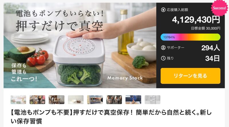 目標金額3万円に対して達成金額410万円、支援者290人を集めている「メモリーストック」は、studio adamasによるプロジェクトだ。電池やポンプを使わず、押すだけで真空状態を作れるシンプルな構造が特徴となっている。複雑な操作を必要としないため、誰でも直感的に使える点が大きな魅力だ。
