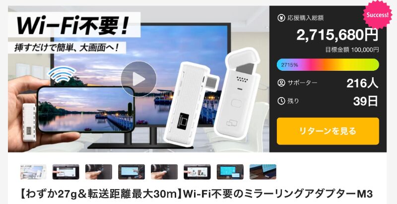 スマートフォンの画面を大きなテレビやモニターに簡単に映せる「ミラリングアダプターM3」は、たった27gという軽さと最大30mという転送距離が特徴の小型デバイスです。通常、この手の製品はWi-Fi環境に依存したり、アプリのインストールが必要だったりと手間がかかることが多いですが、本製品はWi-Fi不要で手軽に使えるのが最大の魅力。プレゼンやオンライン授業、旅行先での動画鑑賞など、シーンを選ばず使える点が評価され、すでに210名もの支援者が参加しています。目標金額10万円に対して270万円以上を集めていることからも、多くの人々が「これが欲しかった」と感じていることがうかがえます。